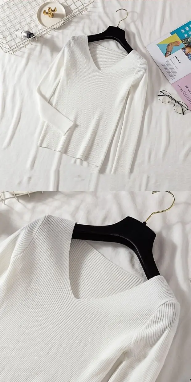 2025 Fashion V-neck Elastic Basic Top New Women Sweater Long Sleeve Pullover Female Winter Solid Knitted Jumper
