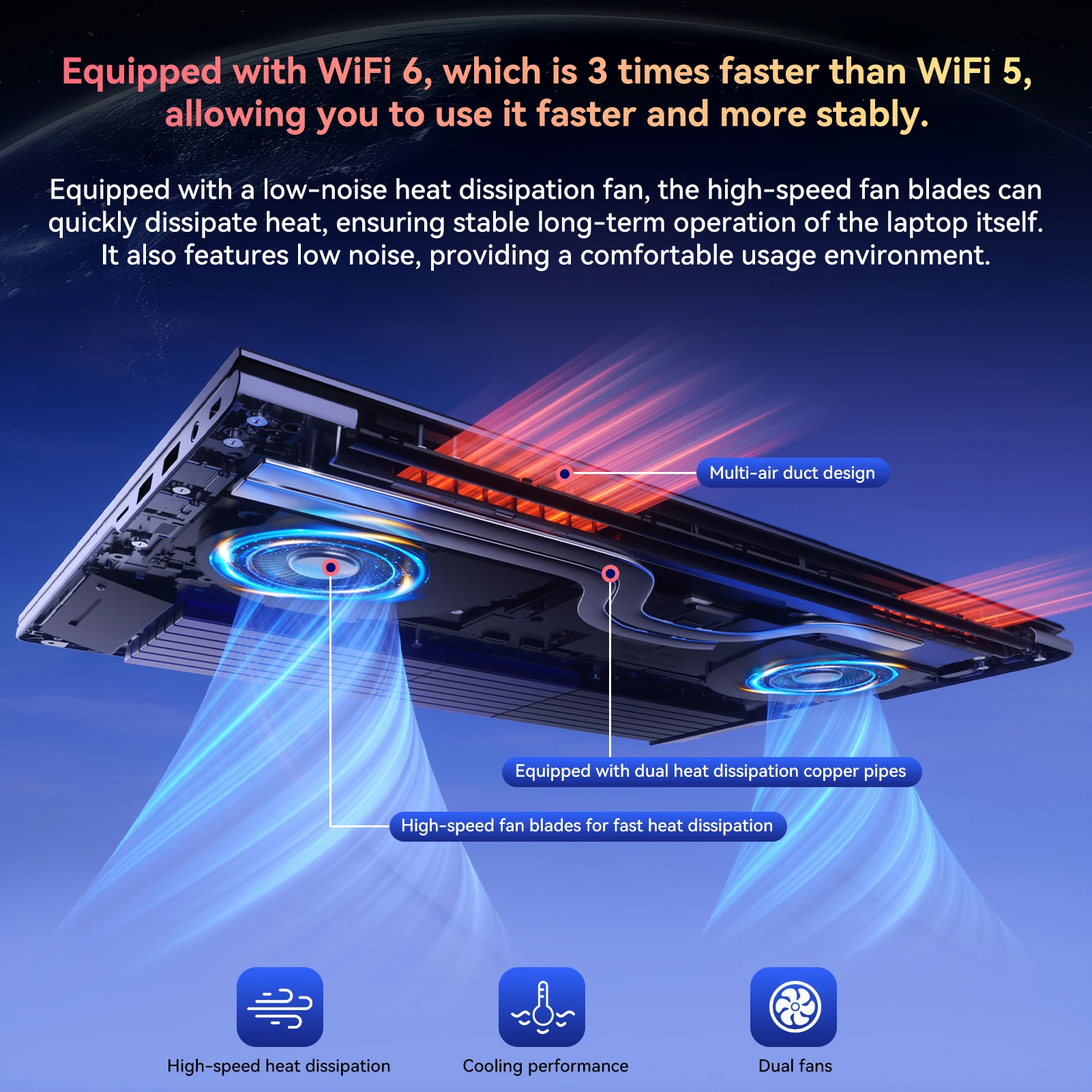 Dual copper pipes + multi-air duct + high-speed fans—cools fast with low noise for stable long-term use.
