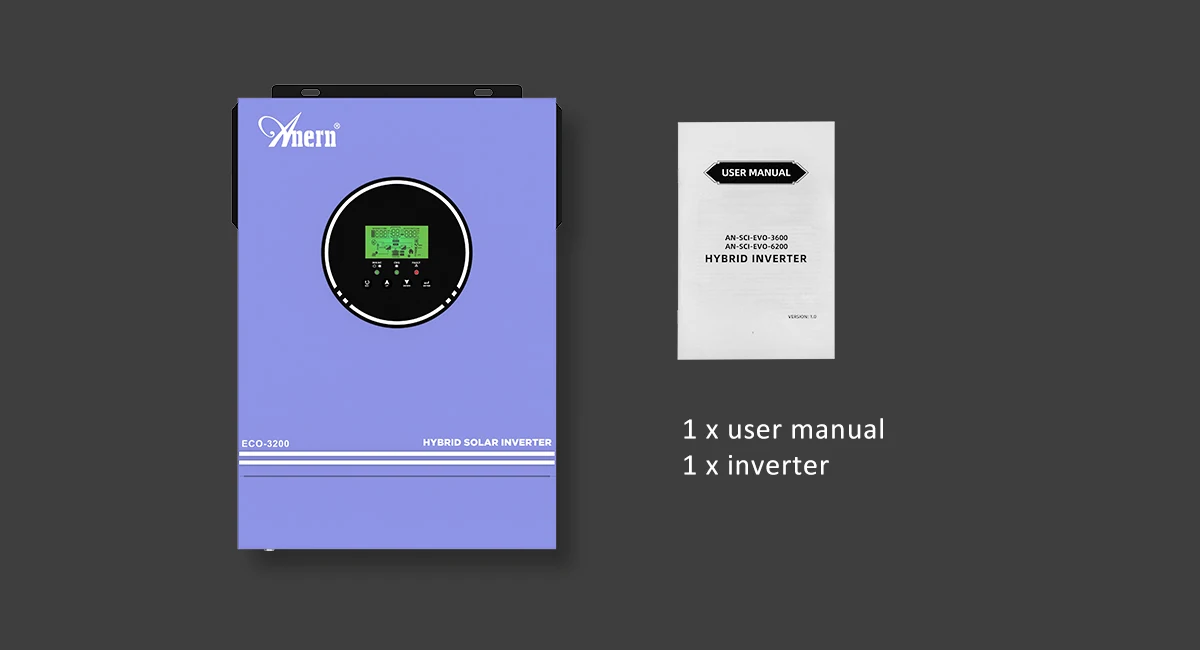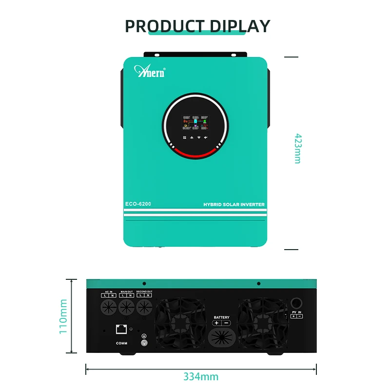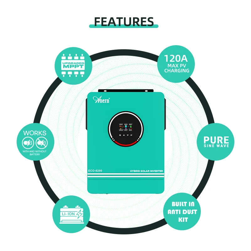 Anern 6.2KW 4.2KW 3KW 1.6KW Hybrid Inverter Off Grid Dual AC Output MPPT 120A on Grid Solar Inverter 48V 24V 12V 230V PV 500Vdc