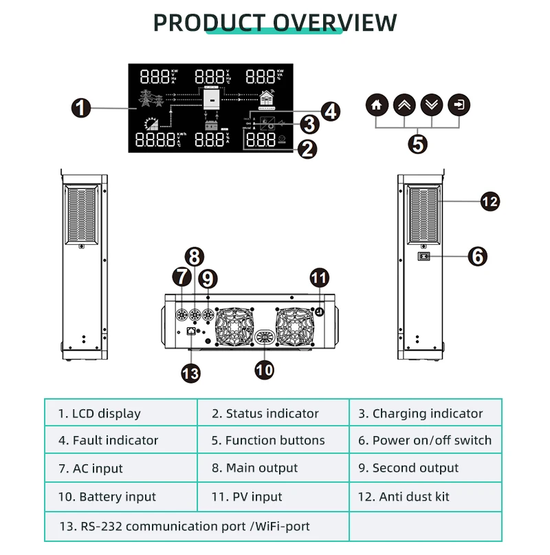 4. Shutdown sequence: turn off the switches of load, PV and mains, turn off the inverter, and finally turn off the battery.