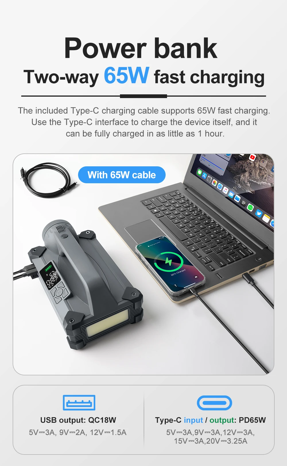 The included Type-C charging cable supports 65W fast charging. Use the Type-C interface to charge the device itself, and it can be fully charged in as little as 1.5 hour.
