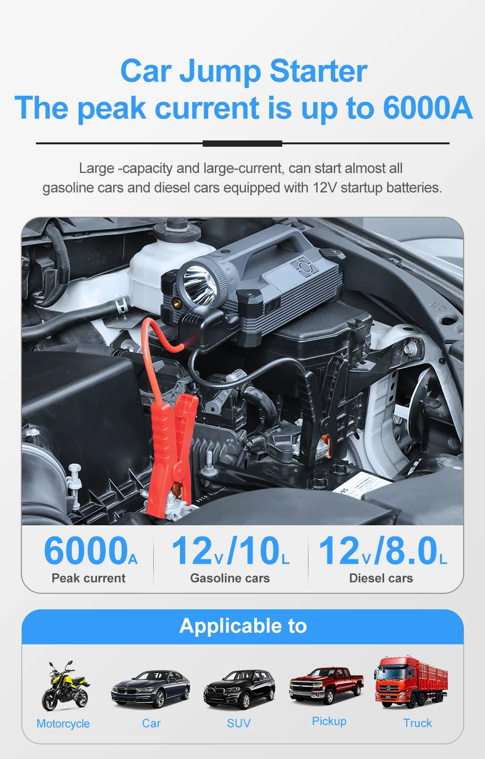 Large -capacity and large-current, can start almost all gasoline cars and diesel cars equipped with 12V startup batteries.