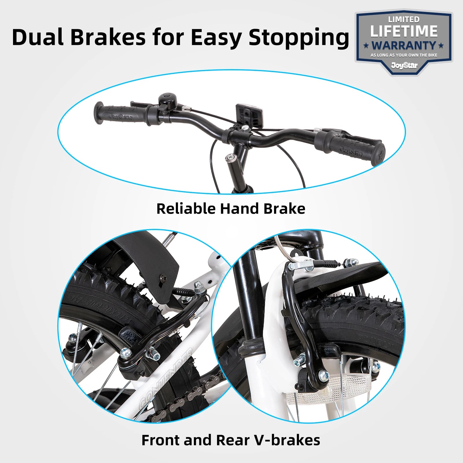 Providing consistent stopping power on both bike trails and the streets are front and rear steel linear pull handbrakes specially designed for smaller hands.