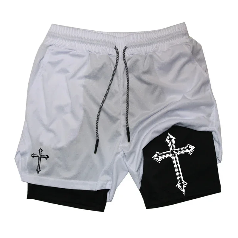 Men's cross printed 2-in-1 training shorts with compression lining Christian gym sports shorts phone pocket towel buckle run
