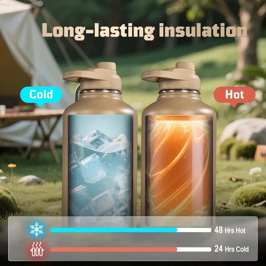 Tactical Half Gallon Water Bottle 64 oz Vacuum Insulated 3 BPA Free Lids Paracord Handle MOLLE Water Pouch Leakproof Sport Bott