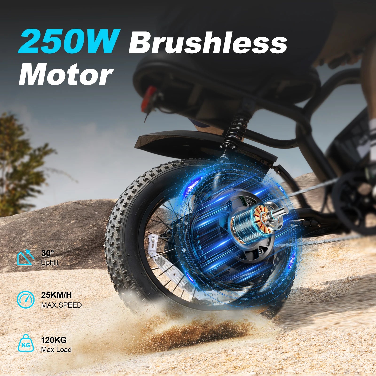800W PEAK BRUSHLESS MOTOR: VDL EBA13 fat tire electric bike for adults adopts a high-speed brushless 500W motor (PEAK 800W), boosted a top speed of 25MPH. Its ample power allows you to climb hills/inclines and conquer off-road challenges effortlessly.