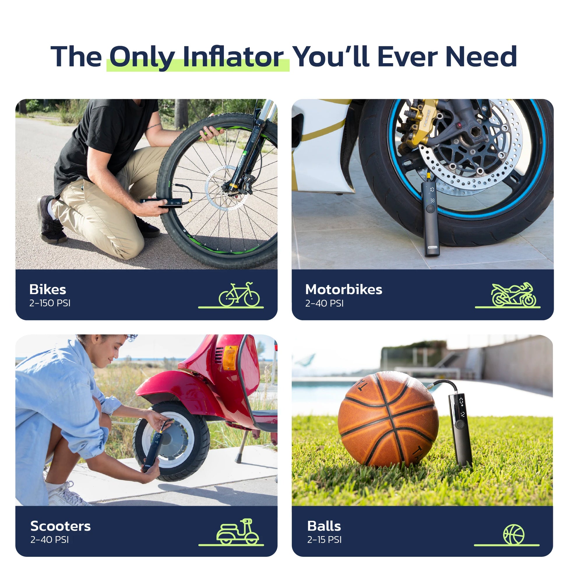 Multiple Modes: Use one of the four programmable modes - bike, motorcycle, sports ball, and customization - to inflate your tires. Plus, the customization mode includes the ability to inflate car tires